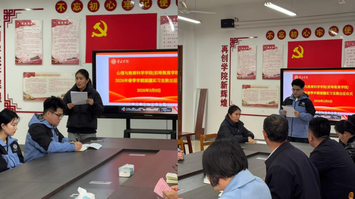 3月9日下午,心理与教育科学学院(初等教育学院)在二楼会议室召开2026年春季援疆实习支教师生座谈会,学院党政领导、辅导员、班主任,援疆支教团43名成员参加,会议由副院长安洪涛主持。上一届援疆支教团代表朱子宁同学结合自身经历,分享支教工作经验与心得,为即将出征的队员送上真挚寄语,鼓励大家坚守初心、踏实工作,在实践中增长才干。本次援疆支教团团长米宝涵代表全体成员发言,表达了不负学校培养、圆满完成支教任务...