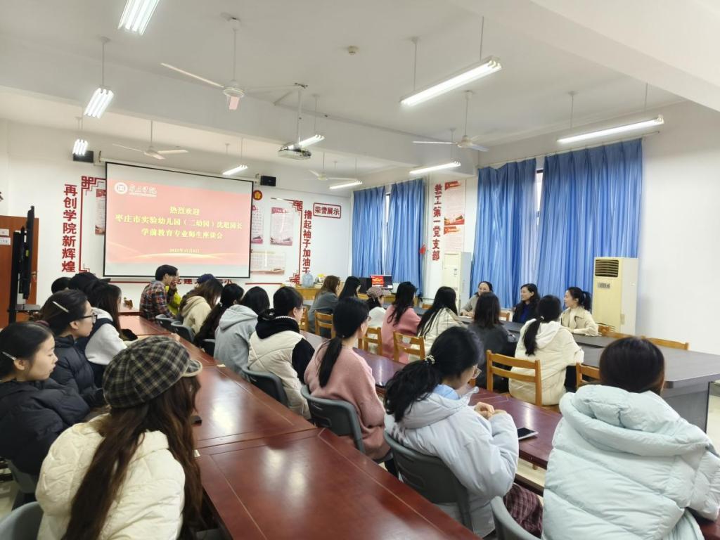 11月8日,枣庄学院心理与教育科学学院(初等教育学院)特邀枣庄市实验幼儿园(二幼园)园长沈超(产业教授)开展走进课堂、师生座谈系列教学活动。学前教育专业负责人、教研室主任、骨干教师和学前教育学生参加此次活动。