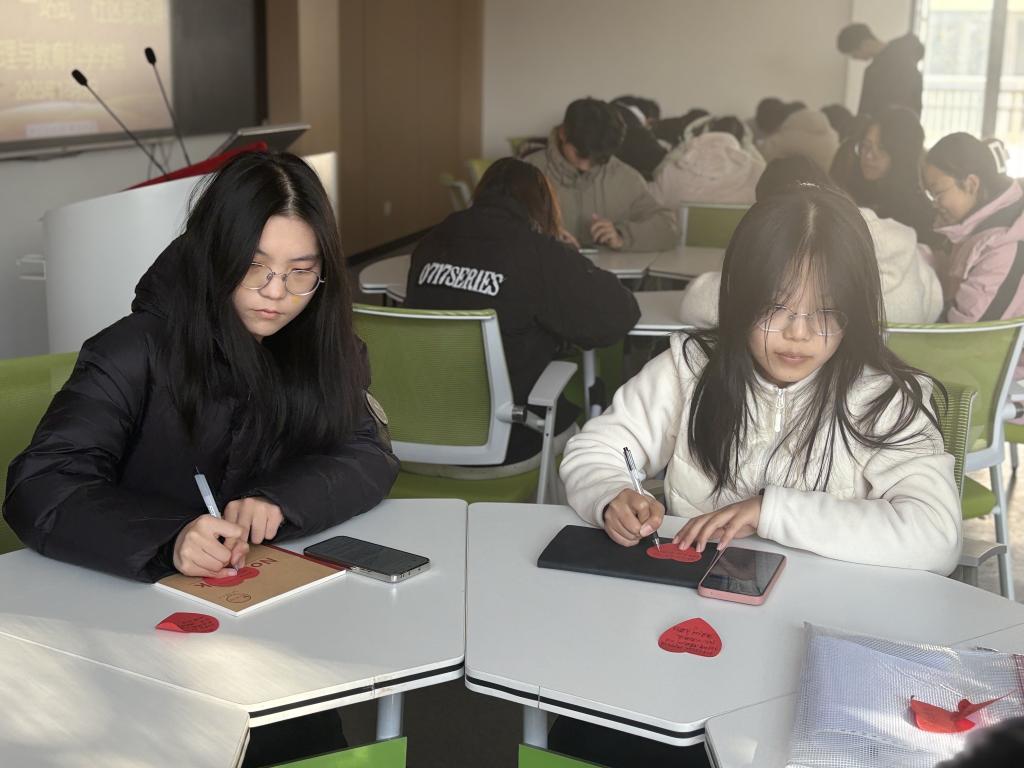 活动现场,学院易班工作站站长张艳婷围绕二十届四中全会精神核心要义,结合中华诗词中蕴含的家国情怀、民族气节,鼓励同学们将个人理想融入国家发展大局。随后,易班工作站负责教师张丽嫱强调,“一站式”学生社区是思政教育的重要阵地,希望同学们在参与中深化理解、凝聚共识,充分用好易班平台的优质学习资源,在参与活动中深化对全会精神的理解、凝聚青春奋进共识。宣讲结束后,同学们以诗词为桥,紧扣全会提出的 “坚持和完善中国特色社会主义制度”等核心内容,用爱心形状的便签,写下对祖国的祝福与奋斗誓言,逐一粘贴在“初心墙”上,一颗颗 “爱心”生动诠释了新时代青年的家国情怀。