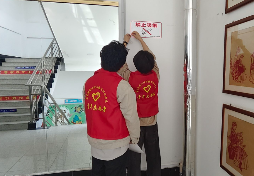 此外,志愿者们还对校园内的禁烟标识进行了全面排查与维护,仔细擦拭原有标识,及时更换破损、模糊的标牌,并在重点区域补充张贴新的警示标识,确保禁烟提醒“抬眼可见、驻足即观”,持续强化师生的视觉警示与行为约束意识。